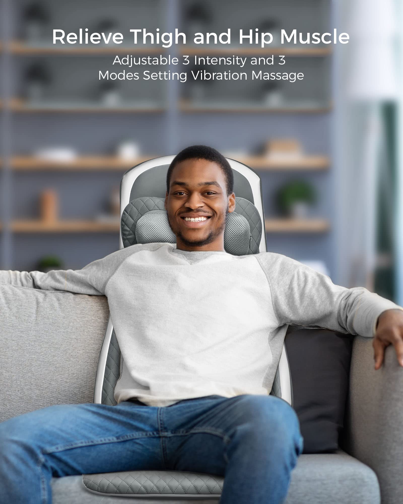 Our 3D massage seat cushion offers an exceptional level of relaxation. Optional heat gently envelops your back, neck, and shoulders, melting away muscle tension and enhancing blood circulation. With powerful vibration motors and additional motors in the seat, our full body massager pampers your hips and thighs, transforming any seat into the ultimate comfort zone. Experience the perfect combination of heat, shiatsu massage, vibration, and lumbar support for unparalleled relaxation.