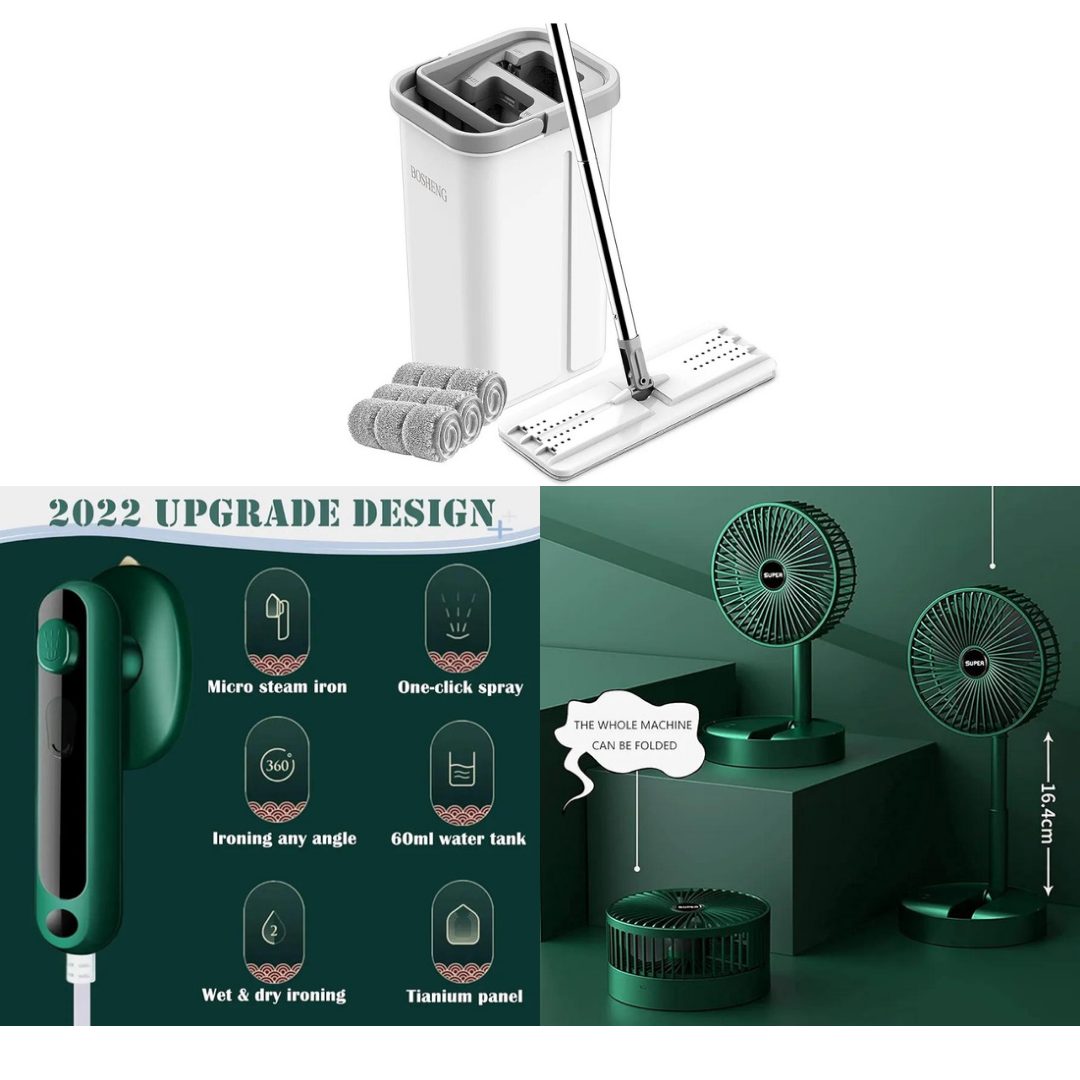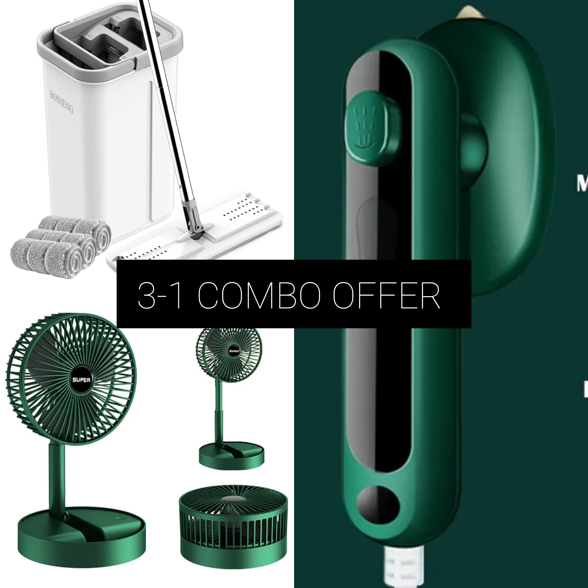 SELF WRINGLING MOP + MINI STEAM IRON + PORTABLE RECHEARGEBLE FAN – ALL IN ONE PACKAGE !!