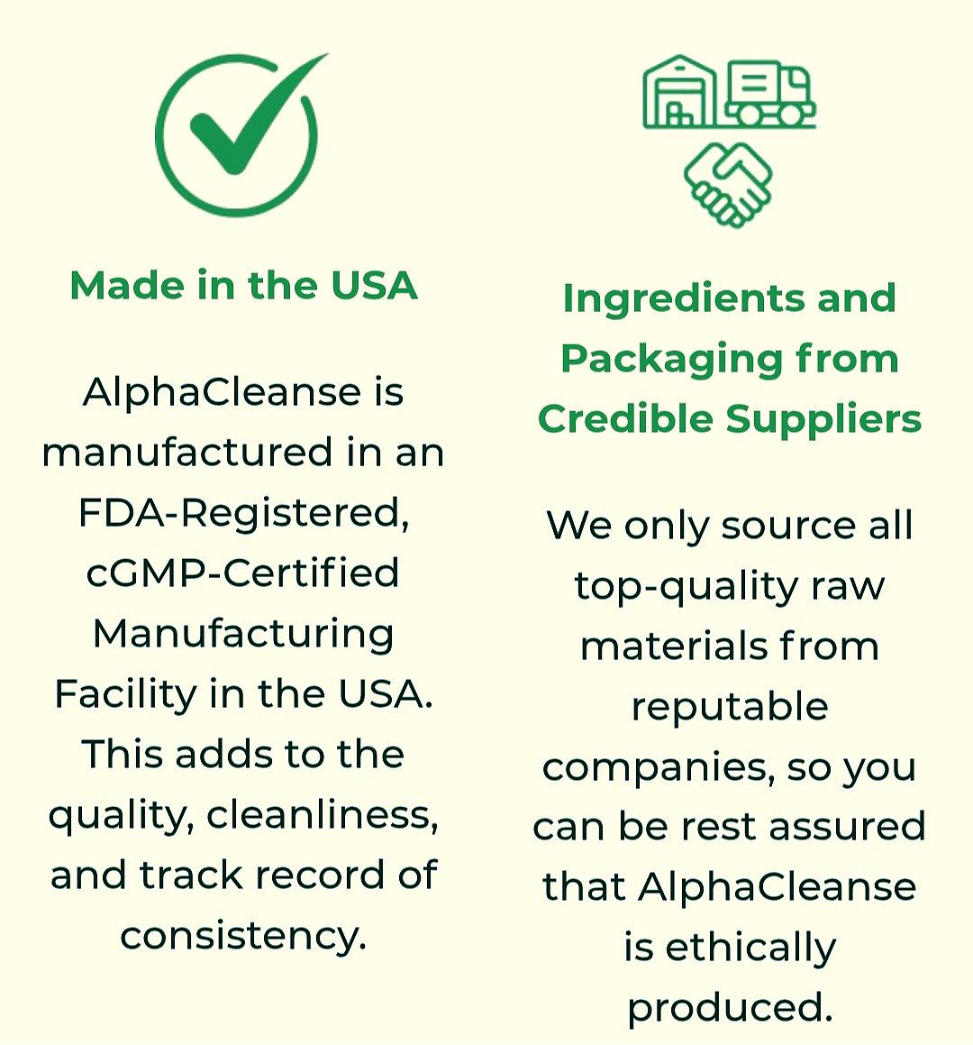 On top of that, AlphaCleanse is manufactured in a GMP-certified and FDA-registered facility in the USA. Which also means that the highest safety standards are maintained throughout the manufacturing process, ensuring that you receive a high-quality product.