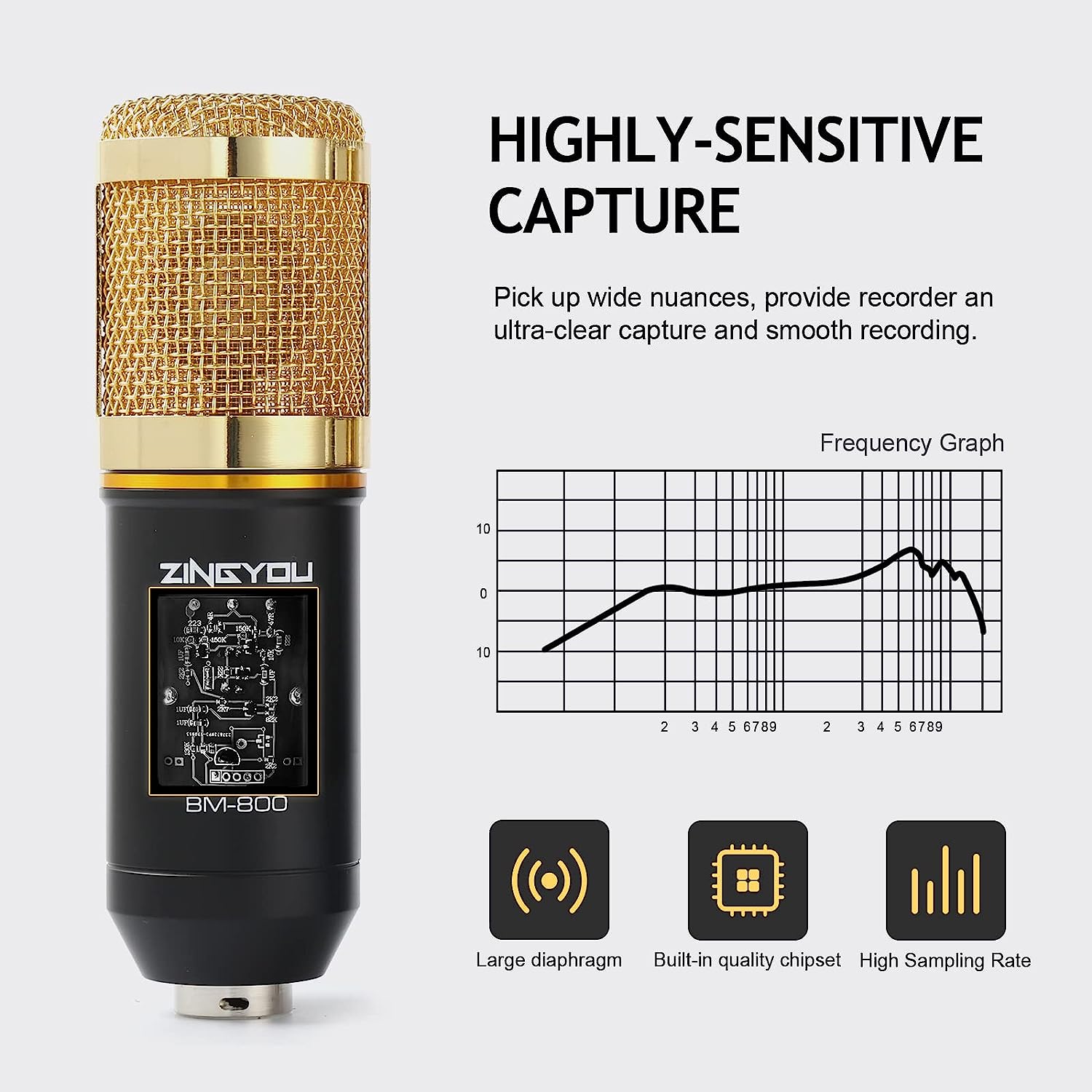 The BM-800 is a versatile mic capable of capturing both vocals and instruments with exceptional precision. Its wide frequency response makes it an ideal choice for vocals, acoustic guitars, pianos, and strings, capturing every subtlety and nuance for a truly immersive experience.