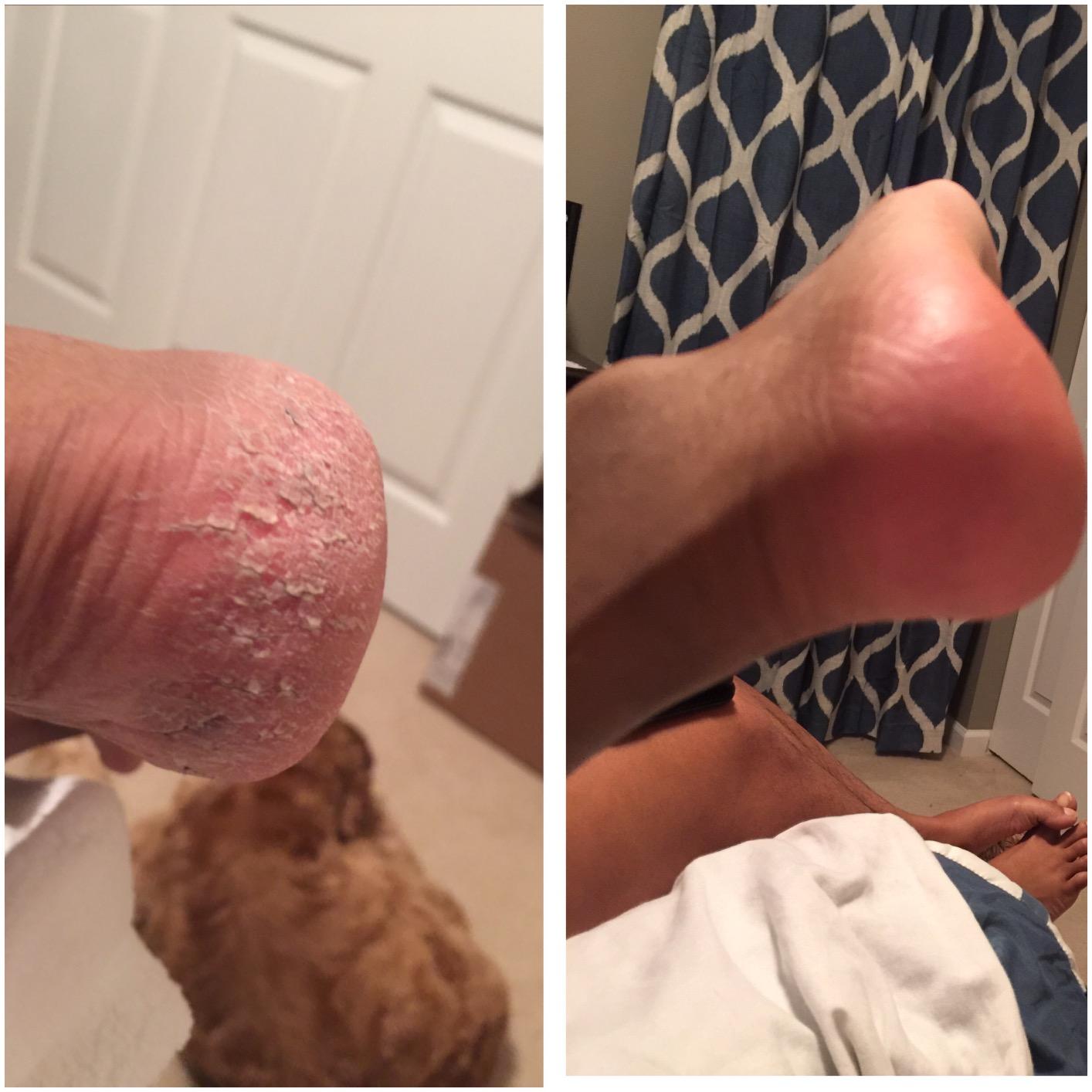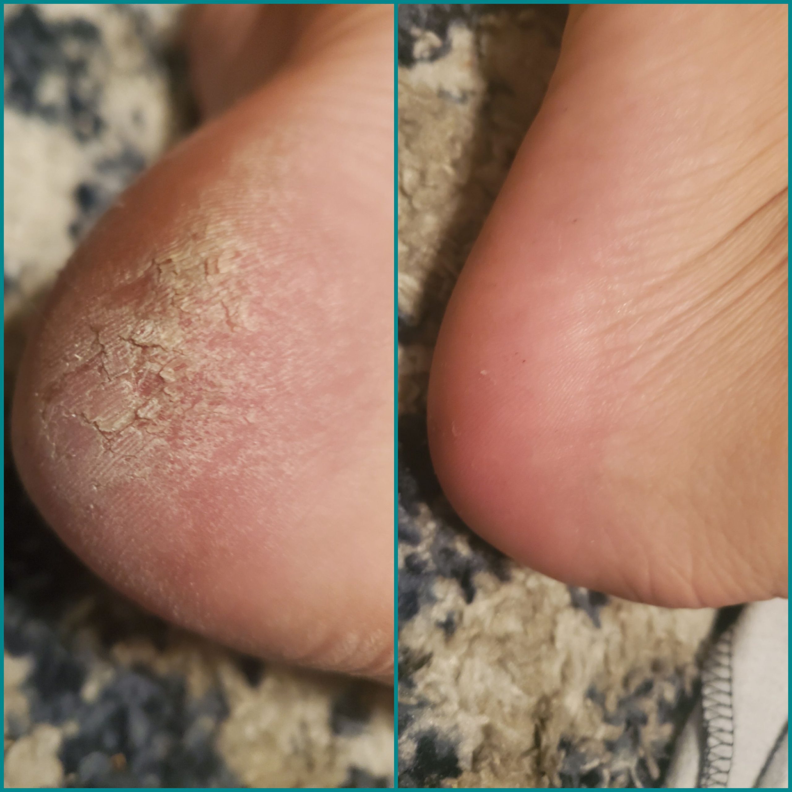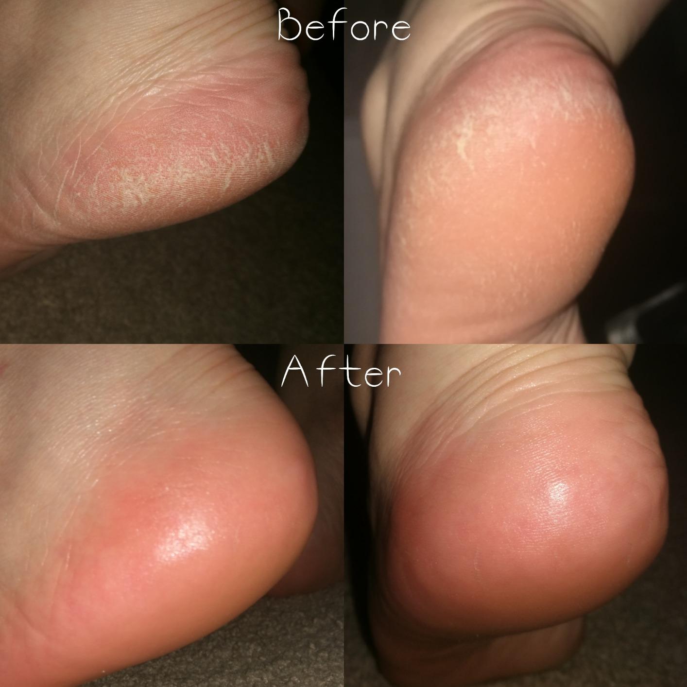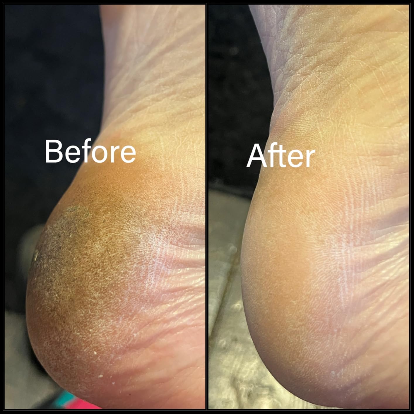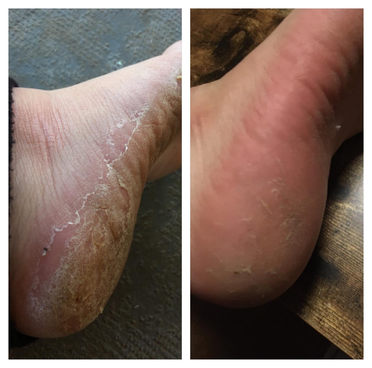 Notice the visible difference on the heel (before vs. after) – rough calluses are gone, revealing soft, smooth skin.
