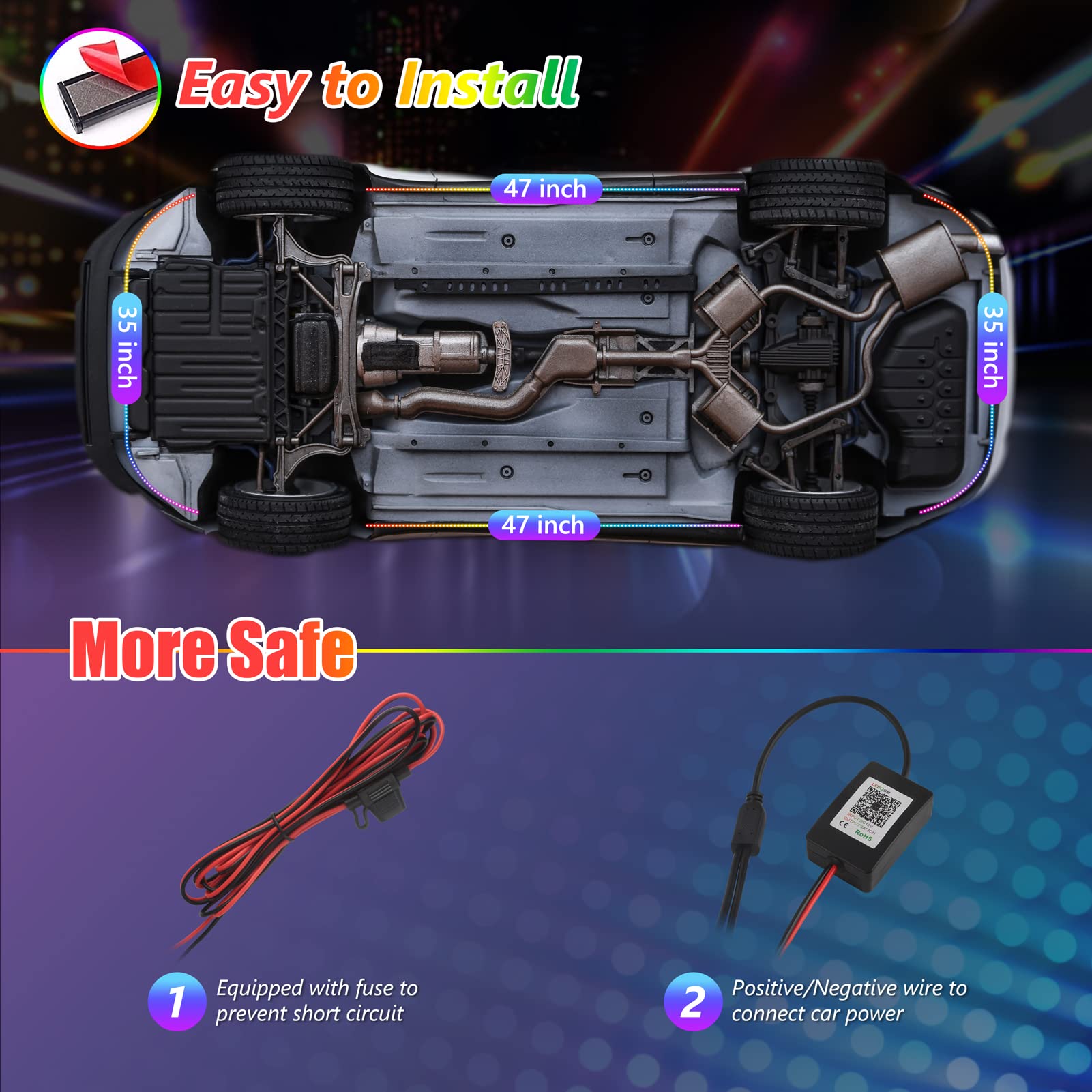 The Car Interior LED Lights come with a remote control for the lights and a control box for the music. With these two devices, you can control the music and the lights from the comfort of your seat. There is no need to toggle with the lights themselves at all