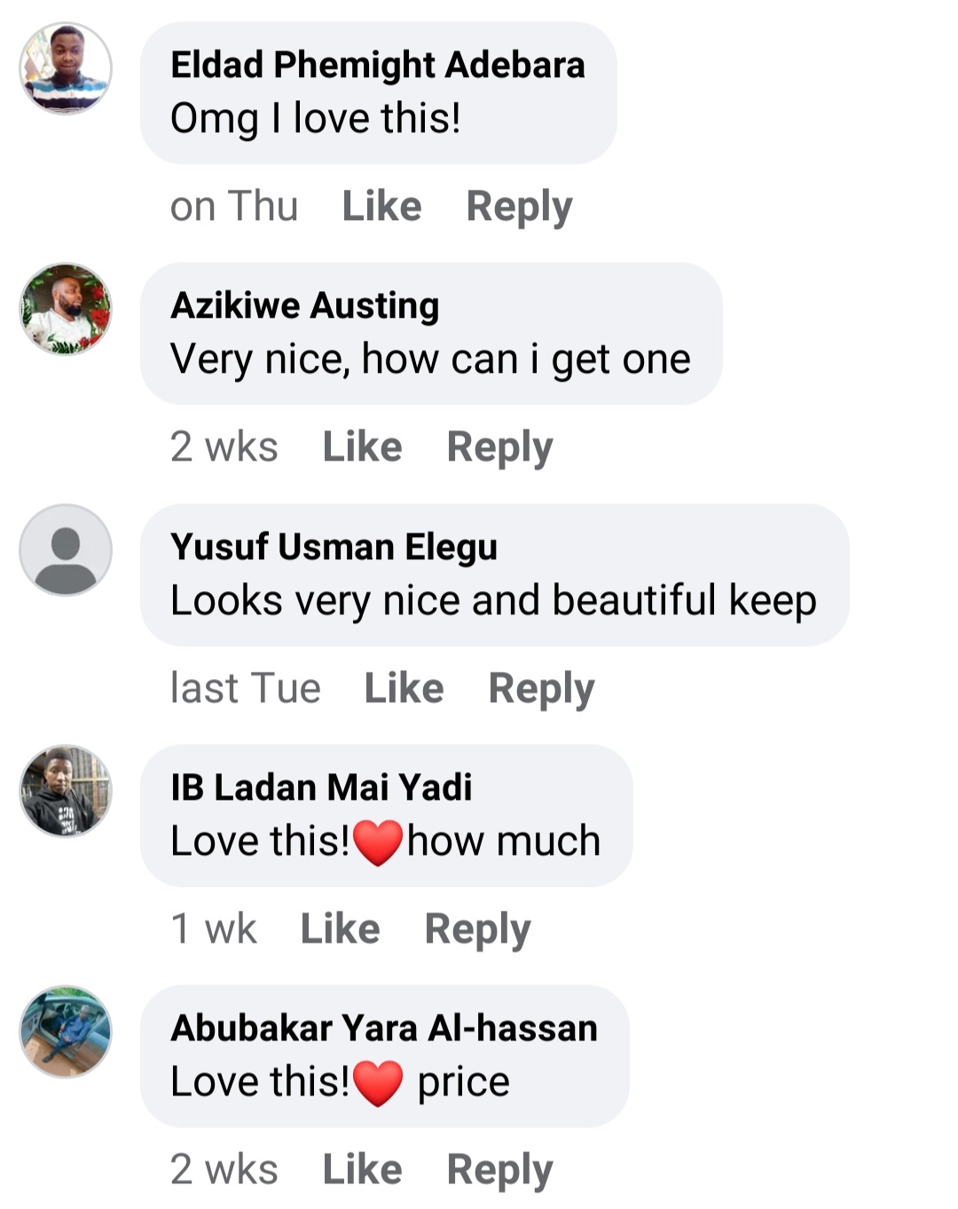 We'll send your product to your doorstep. We offer payment on delivery (cash/transfer).