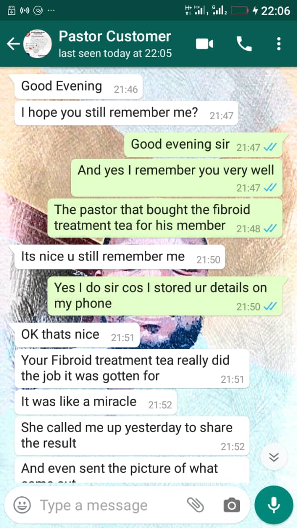 I can testify that this tea works perfectly. Thanks to you guys for this wonderful tea. This is the best thing I have ever seen in my life. I took 3 packs of this tea and my doctor confirmed my fibroid was gone. I can’t thank you guys enough.