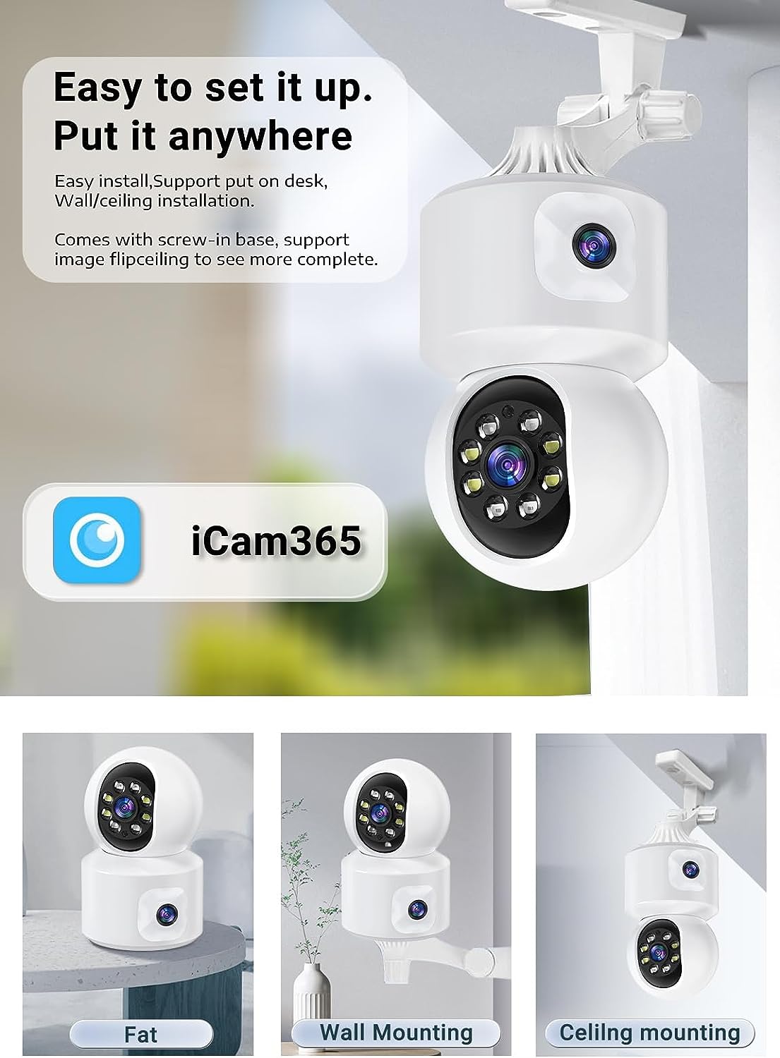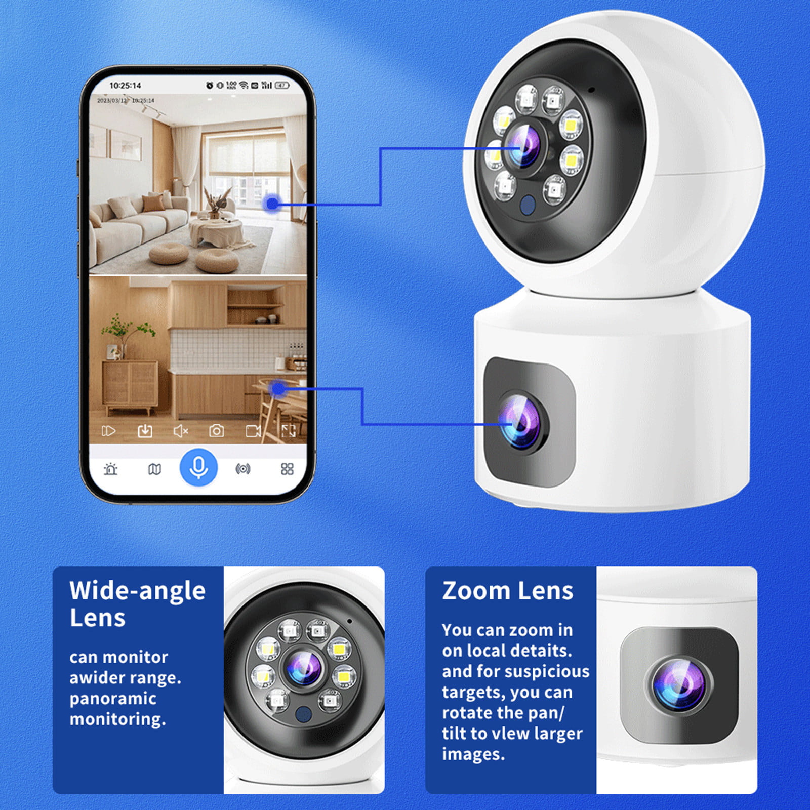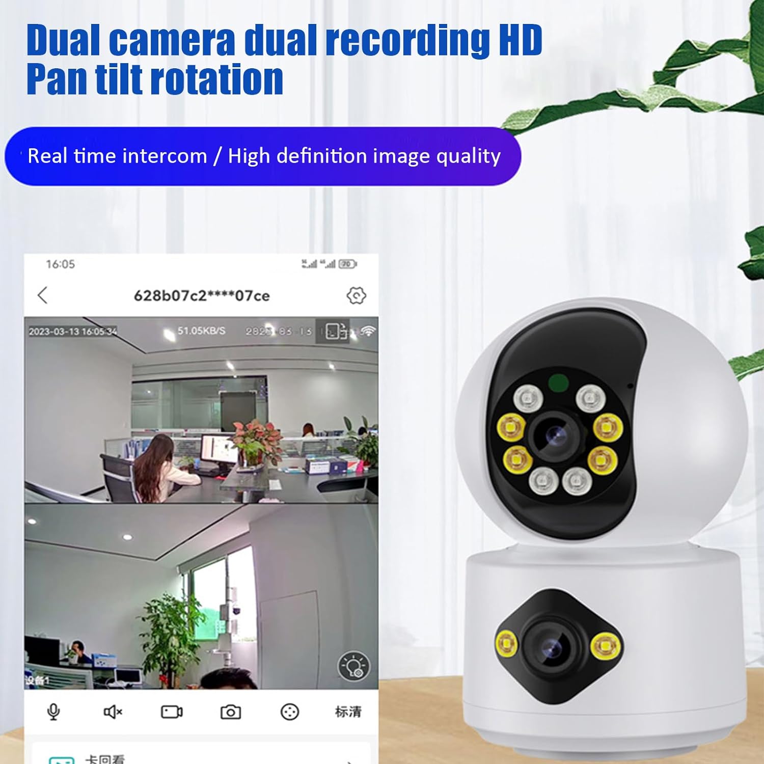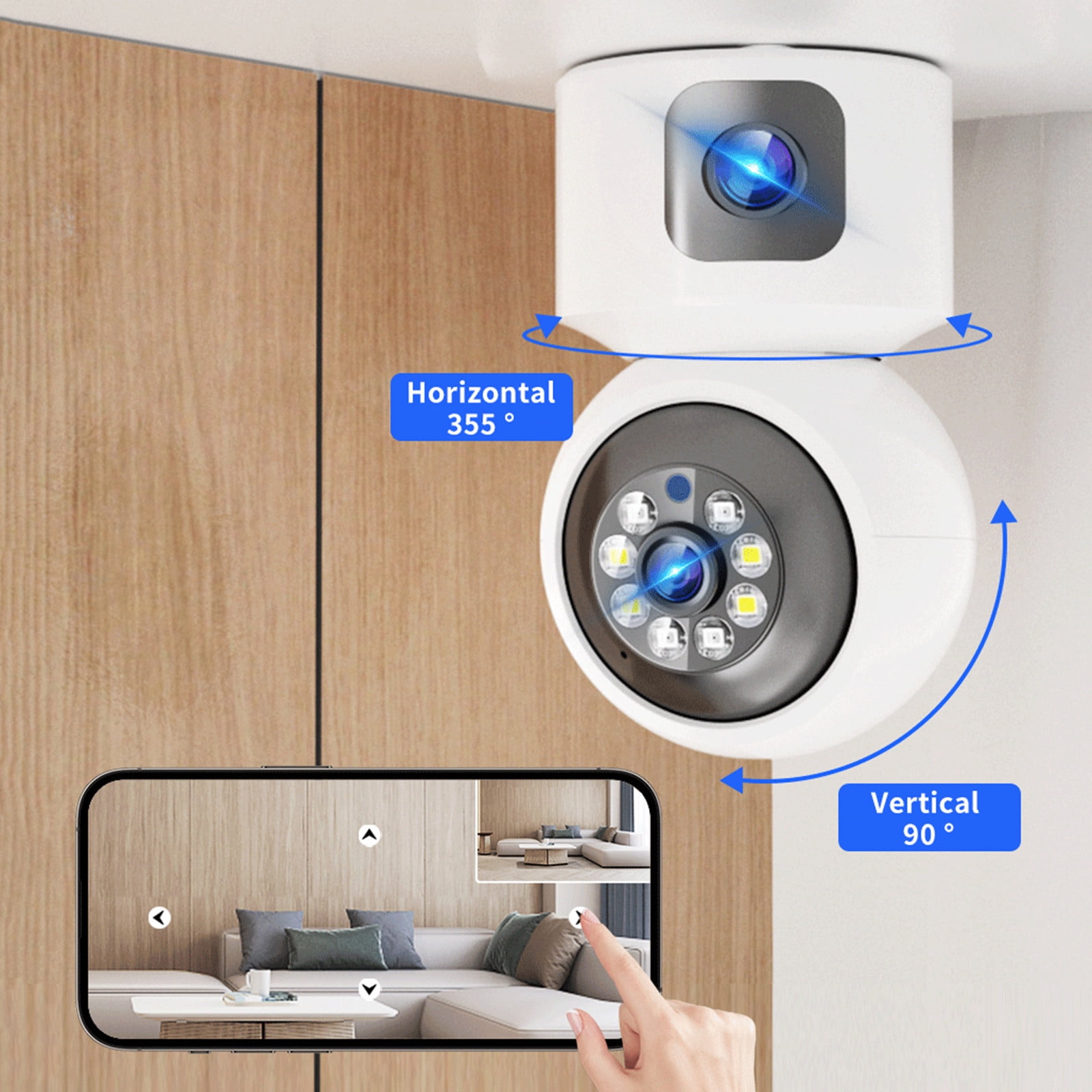 With a simple tap on your phone, the CCTV Dual Lens Camera rotates 360° and tilts 90°, covering every angle you desire. Take Total control in your hands!