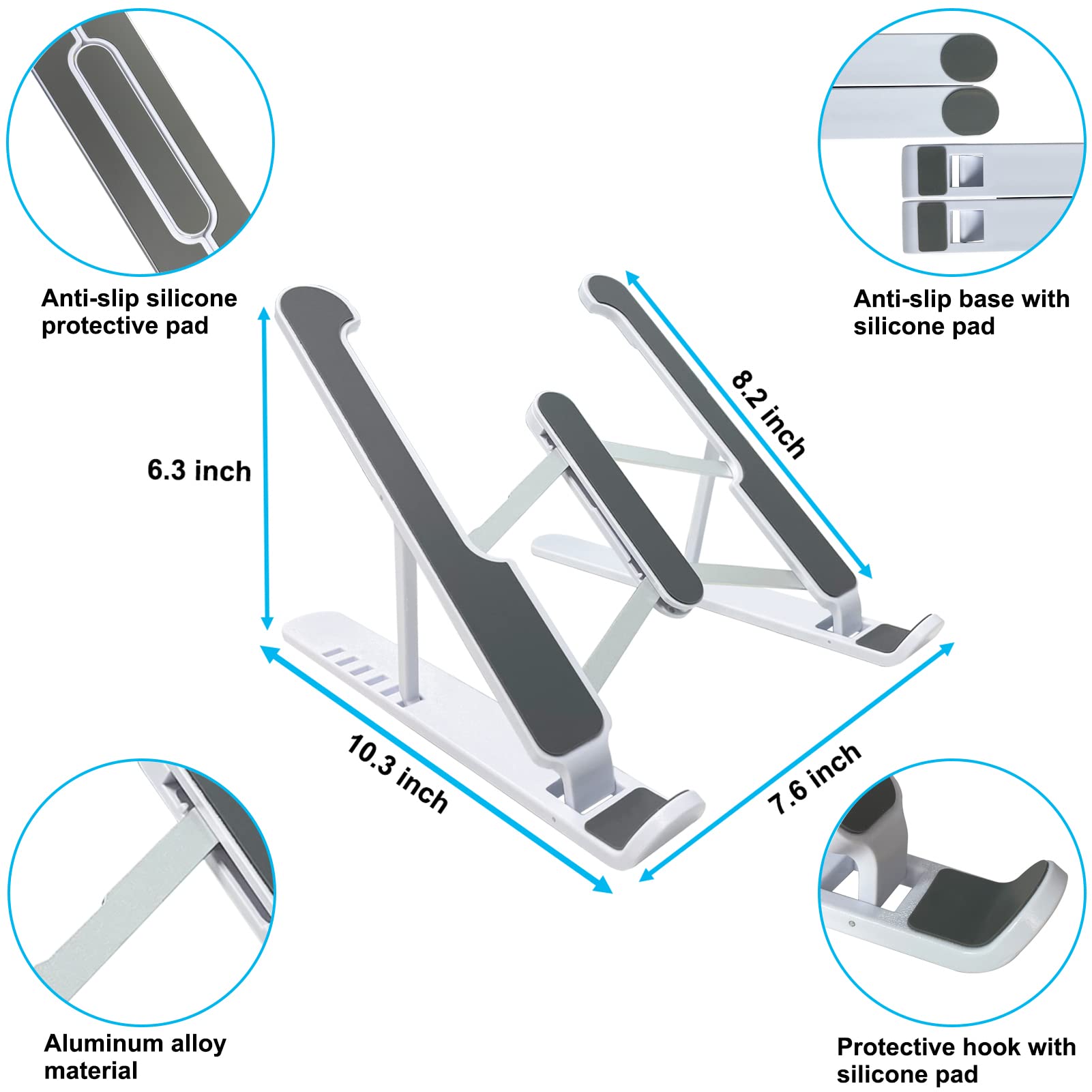 Anti-Slip & Protective: higher and longer lip was designed in front of this adjustable laptop stand, which can hold a more thicker laptop/tablet. No need to worry about your laptop sliding away from this aluminum laptop stand any more.