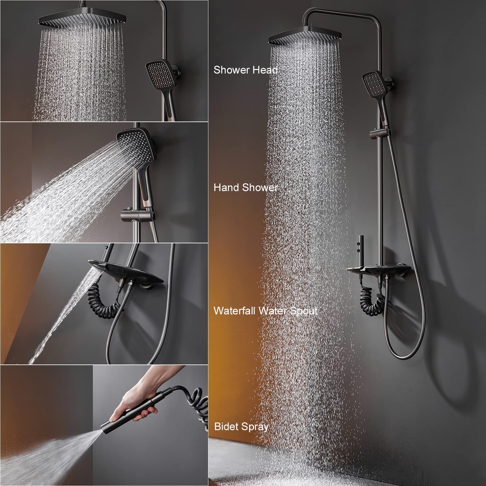 1. 4 Function Shower System: rainfall shower, overhead, handheld shower, handheld sprayer and tub spout.