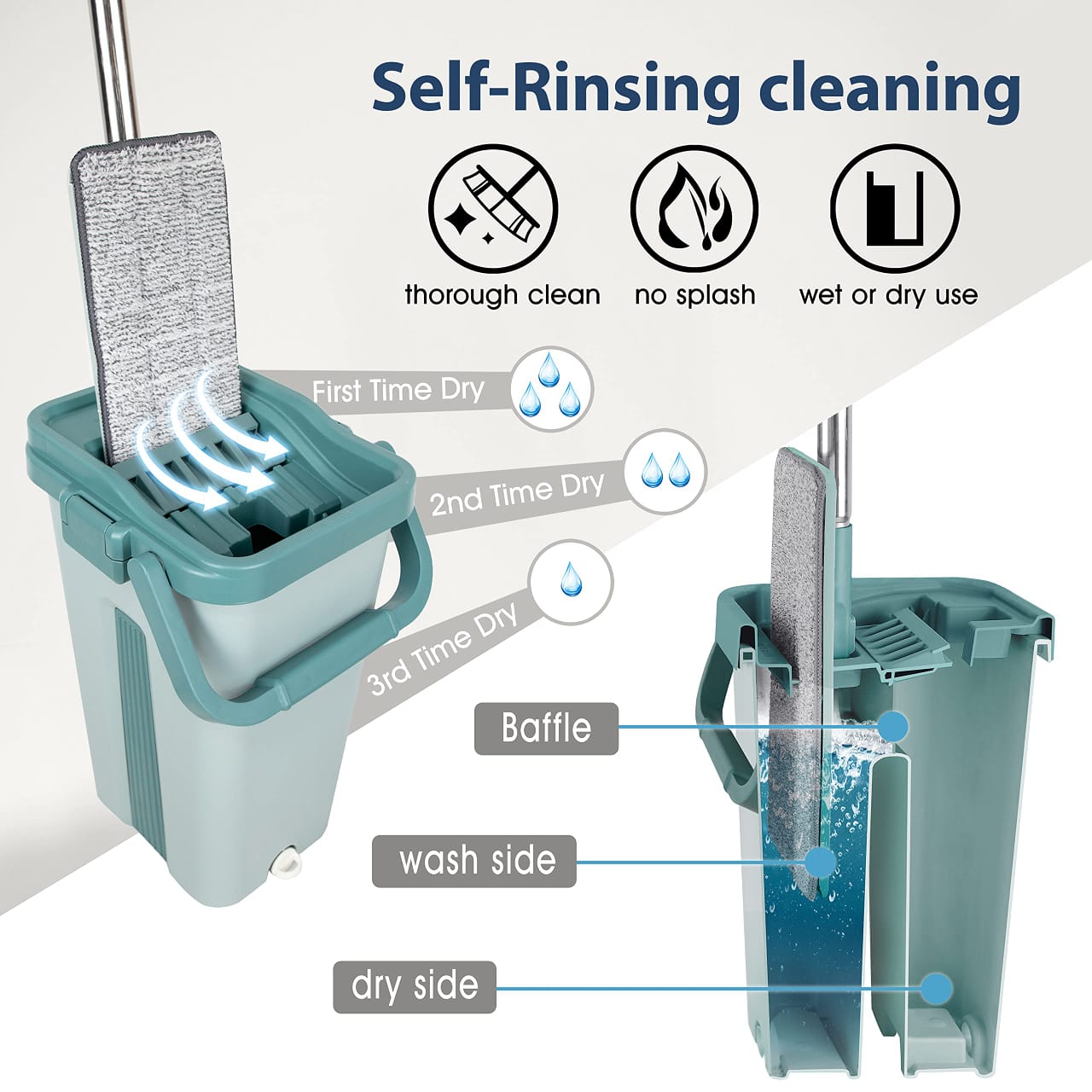 - Get the mop dry easily with the self-cleaning bucket. Keep your hands free from germs and dirt