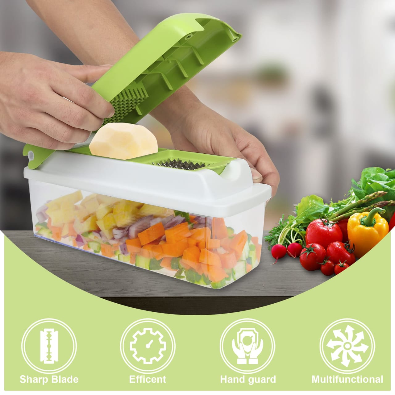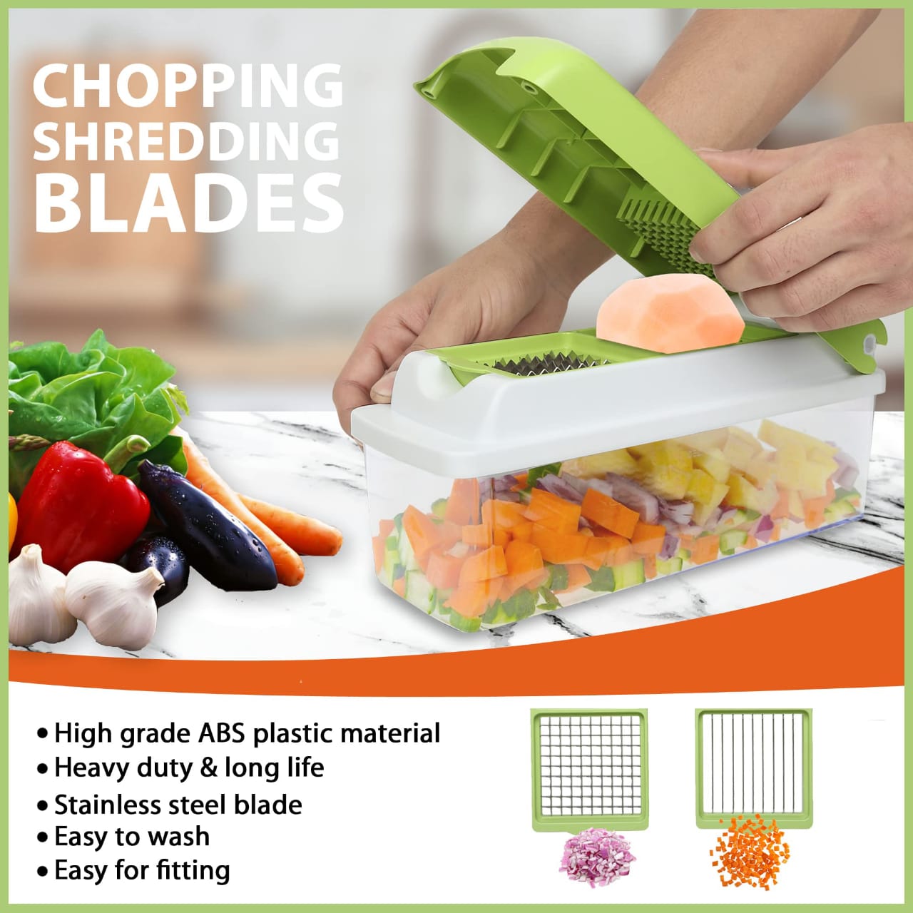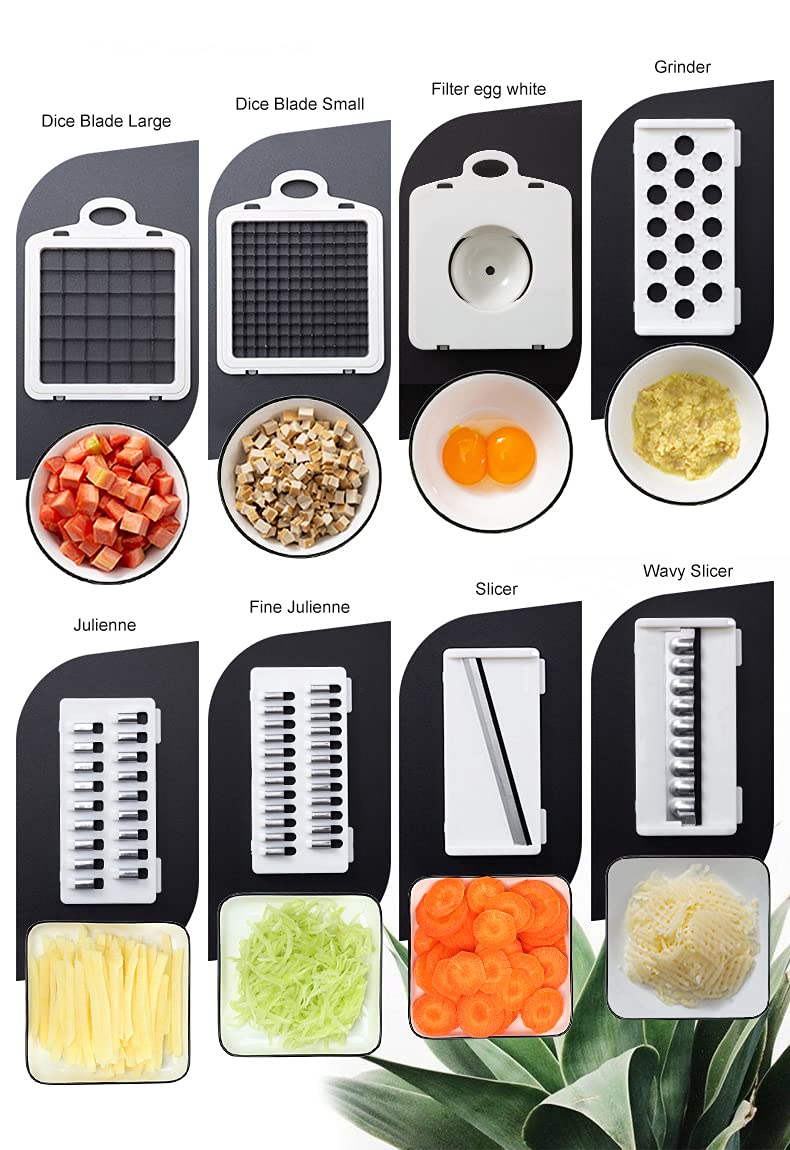 This Multi-Purpose Nicer Dicer is made of the highest quality materials and manufacturing process to bring you a superior kitchen tool for the home. This Vegetable Cutter allows you to hold prepared vegetables in the cutter until ready to start cooking. The onion chopper includes a drain basket and a large container, so you can wash the vegetables and fruits directly after cutting and slicing.