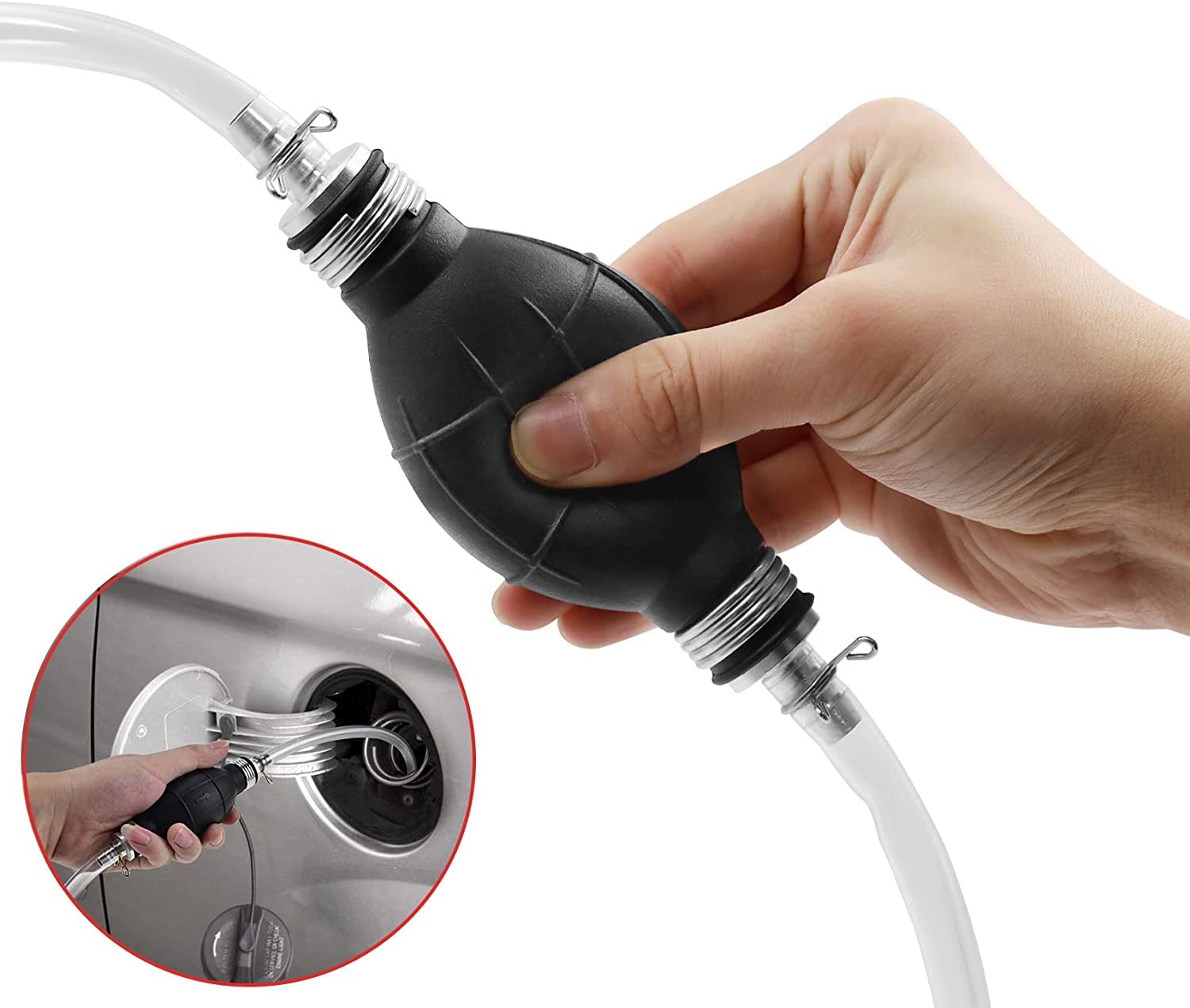 2. HIGH QUALITY PREMIUM MATERIAL: Rubber hand pump that starts siphoning liquid flow quickly. 2 flexible Durable PVC transparent hoses provide easy reach into containers, are petrol resistant, and avoid corrosion.