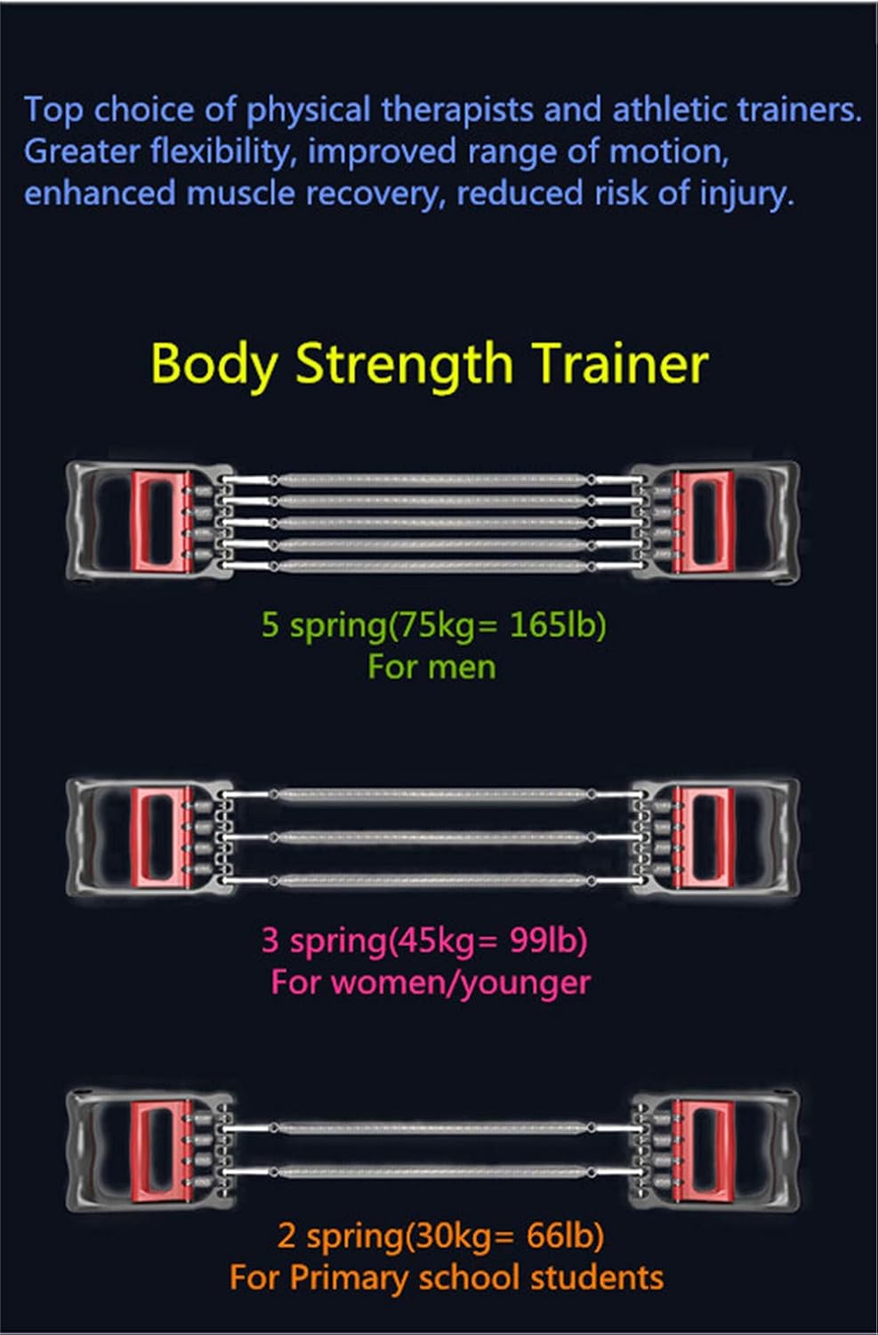 The grip can be adjusted from All 5 springs are removable to adjust the resistance from 13 lbs to 66 lbs (6-30 kg). suitable for different training levels. Just extend the handles and foot pedal to your desired level.