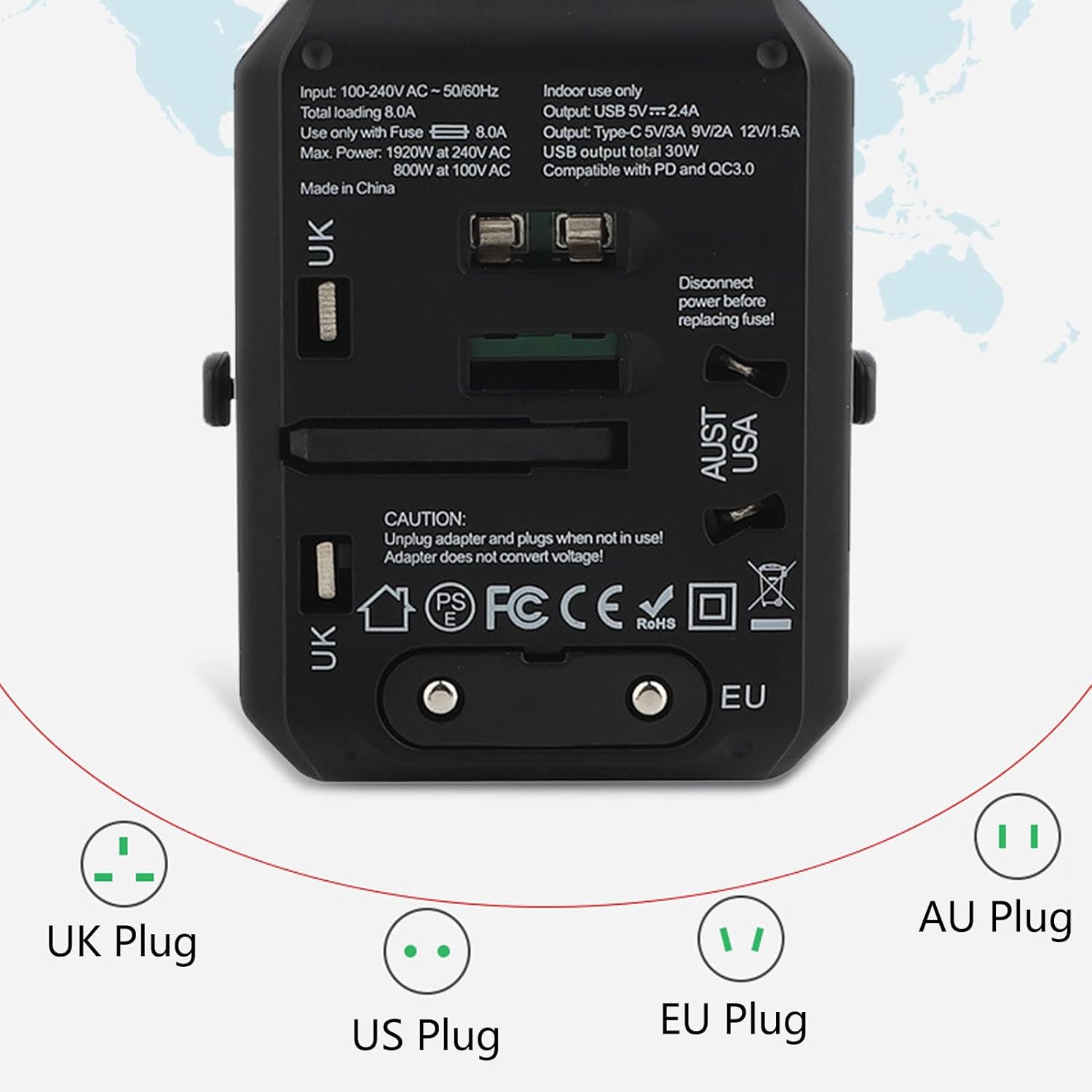 Our world travel adapter has 4 kinds of international standard plugs for USA, EU, UK and AUS etc. It can work in more than 150 countries including the US, UK, France, Italy, Europe, Australia, China, Japan, etc. It is small and portable making it a perfect fit for travel, it is your best travel accessory
